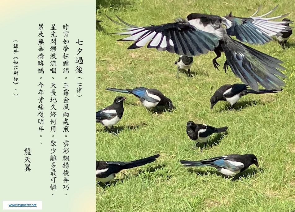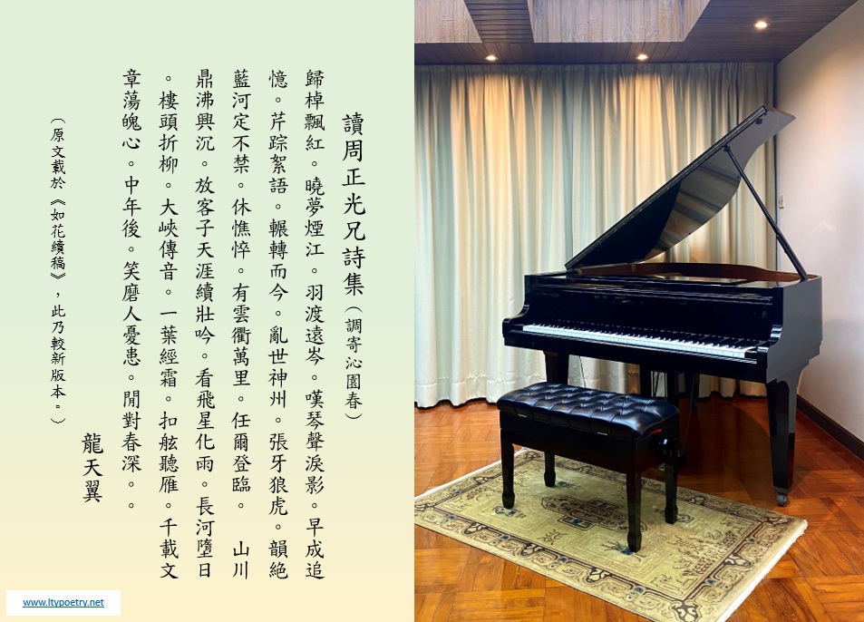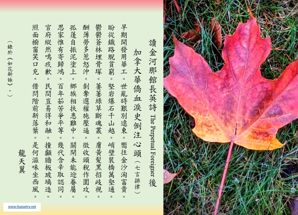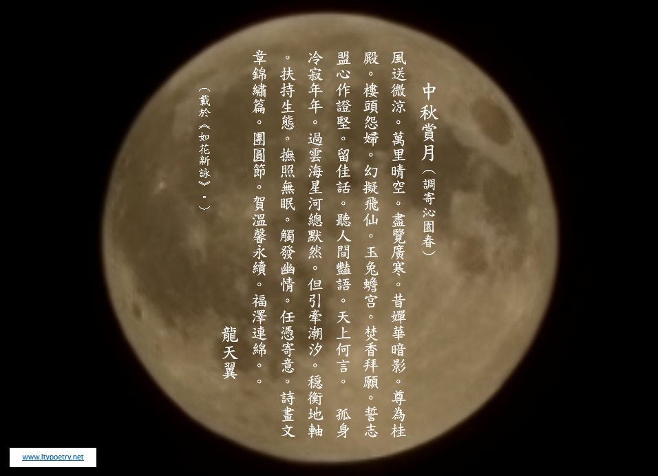 Assorted Chinese poems by Lung, Tin Yick (龍天翼, pinyin: Lóng Tiān Yì) have been uploaded to this website in the format of a JPEG file. In most cases, the image is some combination of text and an accompanying photo. Every JPEG file (composite image) whose icon is displayed in the table of contents beside the title of the poem is the work of the author of the poem while the accompaniment photo(s) may be the creation(s) of the same person or a different individual. Therefore, the names of all contributors involved are shown for each poem unless there was a request for anonymity. Also included for information is the title of book or periodical in which the poem was previously published (in the case of an old work) or the title of a new book in which the poem will be published (in the case of a new work). This table of contents will be updated every time when a new JPEG file of an assorted poem is uploaded. Newest uploads appear at the top.